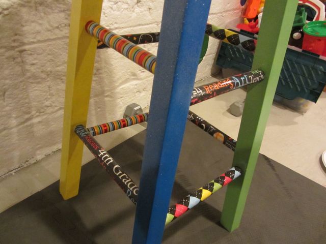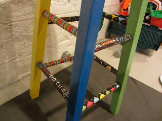 I sprayed the legs with glitter and then starting cutting scrapbook paper to wrap around the 8 rungs on the sides. I made sure the seam was on the under side and held each piece in place tightly for 20-40 seconds. It held firm! Then I mod podged the whole stool 2x and the seat a total of 4x. I also bought a clear varnish because I thought the mod podge might be tacky, but it really isn't! I may still add it anyway. Here is the finished project:I love how the one piece of scrapbook paper says, "4th Grade". It makes me happy. Can you see the glitter on the legs?